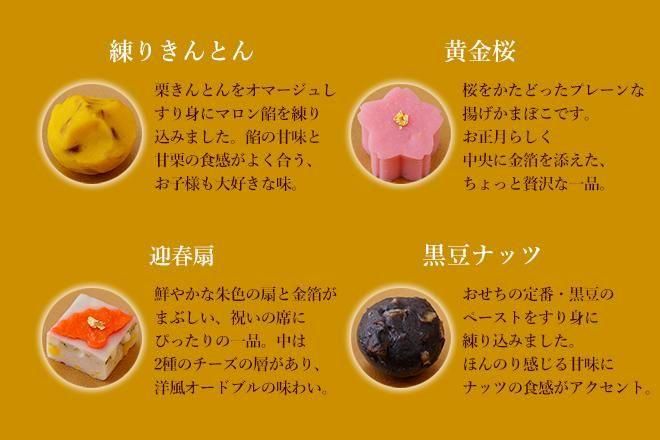 - 黄金桜:桜をかたどったプレーンな揚げかまぼこです。お正月らしく中央に金箔を添えた、ちょっと贅沢な一品。